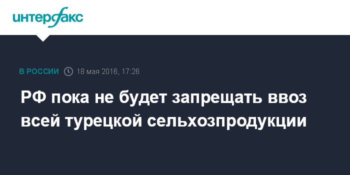 Москва. 18 мая. INTERFAX.RU -Россельхознадзор пока не планирует запрещать поставки из Турции овощей и фруктов, не попавших в санкционный список.