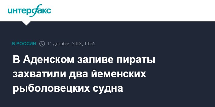 Москва. 11 декабря. INTERFAX.RU - Сомалийские пираты в Аденском заливе захватили два йеменских рыболовецких судна с 22 рыбаками, сообщает в четверг американская телекомпания Си-Эн-Эн.