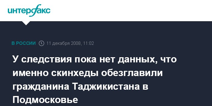 Ранее источник в правоохранительных органах сообщил "Интерфаксу", что голова убитого таджика была обнаружена завернутой в полиэтиленовый пакет в мусорном контейнере на западе Москвы рядом со зданием управы столичного района "Можайский" на западе Москвы.