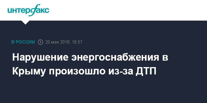 Москва. 20 мая. INTERFAX.RU - Сбой в энергоснабжении Крымского федерального округа, произошедший в середине дня в пятницу, был вызван ДТП с участием грузового автомобиля, повредившего воздушную линию электропередачи, сообщило Минэнерго РФ.