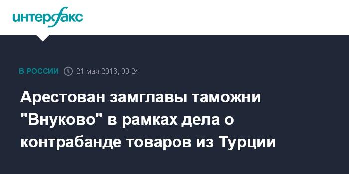 Москва. 21 мая. INTERFAX.RU - Заместитель начальника таможни аэропорта "Внуково" арестован в рамках уголовного дела о контрабанде товаров из Турции, сообщила "Интерфаксу" представитель столичного управления на транспорте СКР Татьяна Морозова.