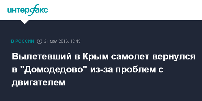 Москва. 21 мая. INTERFAX.RU - Пассажирский Airbus, осуществлявший перелет из Москвы в Симферополь, вернулся в аэропорт "Домодедово" в связи с проблемами с двигателем, сообщил "Интерфаксу" источник в авиадиспетчерских службах московского авиаузла.