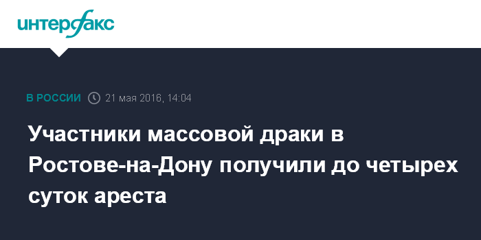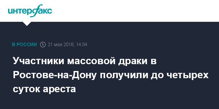 Москва. 21 мая. INTERFAX.RU - Октябрьский районный суд Ростова-на-Дону привлек к ответственности в виде административного ареста 13 участников произошедшей накануне массовой драки, сообщила в субботу агентству "Интерфакс" официальный представитель ГУ МВД РФ по Ростовской области Наталья Устименко.
