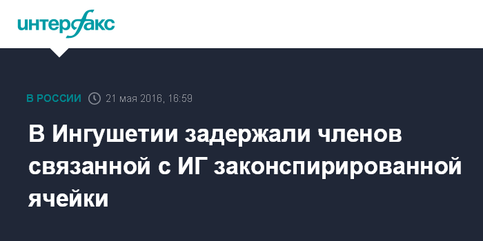 Москва. 21 мая. INTERFAX.RU - В Ингушетии подразделениями ФСБ и МВД России пресечена деятельность законспирированной ячейки, связанной с международной террористической организацией "Исламское государство" (запрещена в России), сообщает информационный центр Национального антитеррористического комитета.