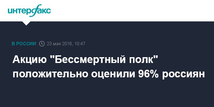 Москва. 23 мая. INTERFAX.RU - Идея проведения акции "Бессмертный полк" воспринимается россиянами безусловно положительно и привлекает все больше участников, сообщает ВЦИОМ.
