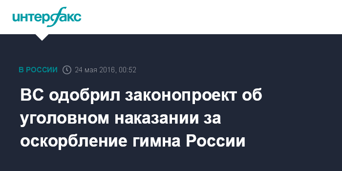 Москва. 24 мая. INTERFAX.RU - Верховный суд РФ одобрил законопроект об уголовном наказании за оскорбление гимна России, сообщает пресс-служба одного из авторов инициативы, сенатора Вадима Тюльпанова.