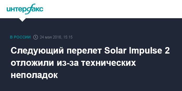 Москва. 24 мая. INTERFAX.RU - Очередной перелет самолета на солнечных батареях Solar Impulse 2 (SI2) отложен из-за технических неполадок, сообщают во вторник организаторы.