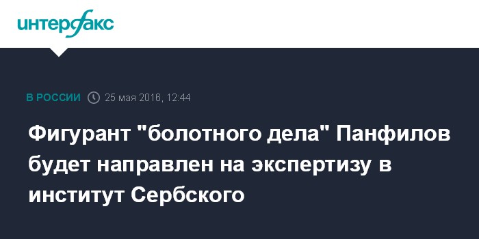 Москва. 25 мая. INTERFAX.RU - Житель Астрахани Максим Панфилов, обвиняемый по делу о массовых беспорядках на Болотной площади 6 мая 2012 года в Москве, будет направлен на стационарную судебно-психиатрическую экспертизу в институт имени Сербского, сообщил "Интерфаксу" адвокат Сергей Панченко.
