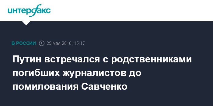 Москва. 25 мая. INTERFAX.RU - Подписанию указа о помиловании Савченко предшествовала встреча президента РФ Владимир Путина с родственницами погибших российских журналистов, в гибели которых она обвинялась, сообщил пресс-секретарь российского президента Дмитрий Песков.