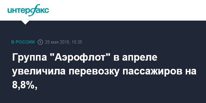 Москва. 25 мая. INTERFAX.RU - Группа "Аэрофлот" в апреле увеличила перевозку пассажиров на 8,8%, до 3,2 млн человек, сообщил перевозчик в среду.