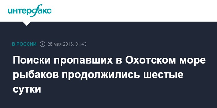 Москва. 26 мая. INTERFAX.RU - Поиски трех рыбаков, пропавших 21 мая в Охотском море на пластиковой моторной лодке, продолжаются на Сахалине, сообщило ГУ МЧС региона.
