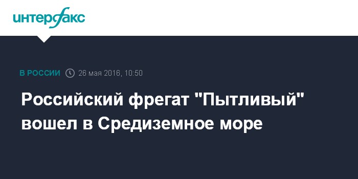 Москва. 26 мая. INTERFAX.RU - Сторожевой корабль Черноморского флота "Пытливый" в четверг утром, пройдя черноморские проливы, вошел в акваторию Средиземного моря, сообщили СМИ, публикующие фотографии прохождения российского фрегата через Босфор.