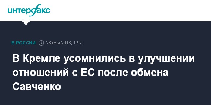 Москва. 26 мая. INTERFAX.RU - В Кремле сомневаются, что возвращение домой российских граждан Ерофеева и Александрова, осужденных на Украине, и помилование президентом РФ украинской летчицы Надежды Савченко могут послужить переломным моментом в нормализации отношений России и Евросоюза.