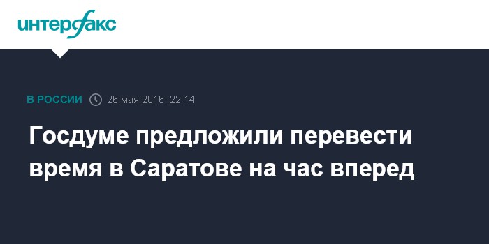 Москва. 26 мая. INTERFAX.RU - Саратовская областная дума просит Госдуму установить в регионе разницу во времени с Москвой "плюс один час". Соответствующая инициатива размещена в четверг в базе законодательной деятельности нижней палаты.