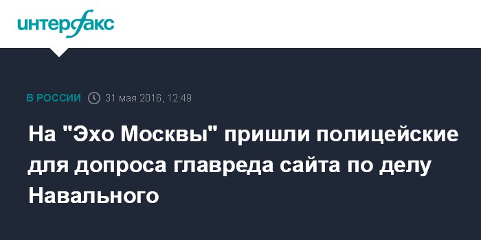 Москва. 31 мая. INTERFAX.RU - Полицейские намерены допросить главного редактора сайта "Эхо Москвы" в связи с уголовным делом против оппозиционера Алексея Навального, сообщил главный редактор радиостанции Алексей Венедиктов.