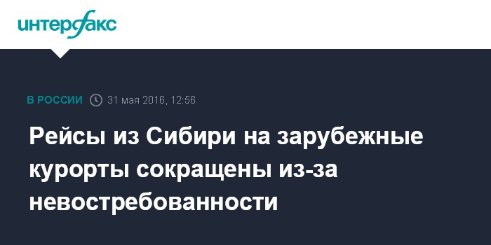 Москва. 31 мая. INTERFAX.RU - В Сибири сокращают полетные программы на зарубежные курорты, рассказала "Интерфаксу" пресс-секретарь Российского союза туриндустрии (РСТ) Ирина Тюрина.