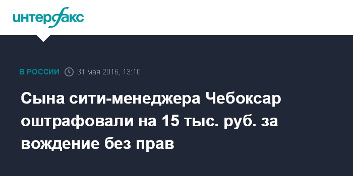Москва. 31 мая. INTERFAX.RU - Сотрудники полиции вынесли постановление о наложении административного штрафа на 17-летнего сына главы администрации Чебоксар (Чувашия), севшего без прав за руль чужого автомобиля и ставшего предполагаемым виновником ДТП с пострадавшими.