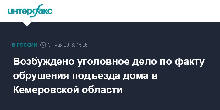 Москва. 31 мая. INTERFAX.RU - Уголовное дело возбуждено по факту обрушения подъезда жилого дома в Междуреченске Кемеровской области, сообщается на сайте регионального СУ СКР.