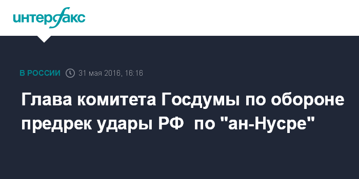 Москва. 31 мая. INTERFAX.RU - Россия не будет тянуть с решением о новых ударах в Сирии по группировке "Джабхат ан-Нусра" (запрещена в РФ), заявил во вторник "Интерфаксу" глава комитета Госдумы по обороне, экс-командующий Черноморским флотом РФ адмирал Владимир Комоедов.