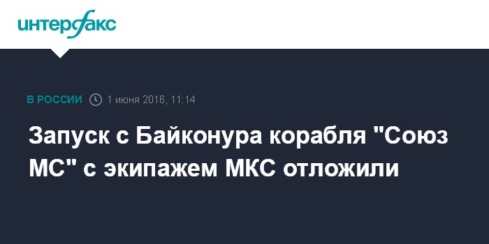 Москва. 1 июня. INTERFAX.RU - Запуск с Байконура транспортного пилотируемого корабля "Союз МС" с экспедицией на Международную космическую станцию (МКС), намеченный на 24 июня, переносится, сообщил в среду агентству "Интерфакс" источник на космодроме.