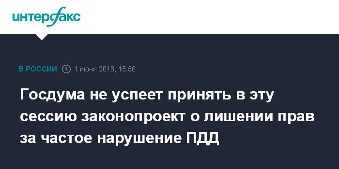 Москва. 1 июня. INTERFAX.RU - Регламент Госдумы не позволяет в ближайшее время принять правительственный законопроект о лишении водительских прав на срок до полутора лет за систематическое нарушение ПДД.