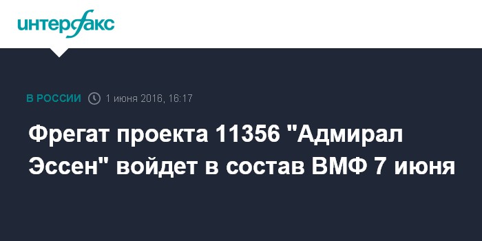 " "Адмирал Эссен" 31 мая сдан заказчику после подписания сдаточного акта. Подъем флага (Андреевского) намечен на 7 июня", - уточнил он.