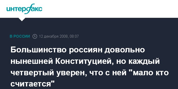 Москва. 12 декабря. INTERFAX.RU - Произошедшие недавно впервые за 15 лет изменения в Основной закон страны внесли коррективы в представления россиян о роли Конституции РФ в жизни государства, показывают исследования социологов.