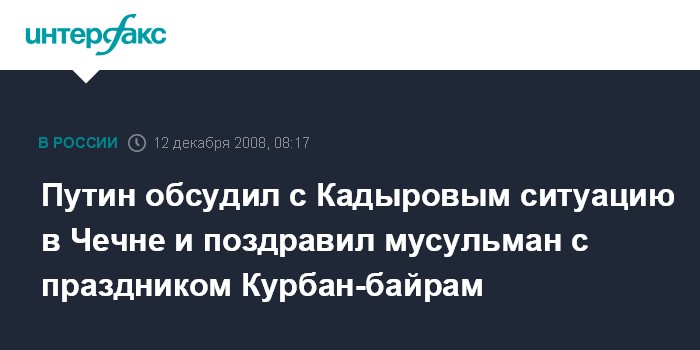Путин обсудил с Кадыровым ситуацию в Чечне и поздравил мусульман с праздником Курбан-байрам