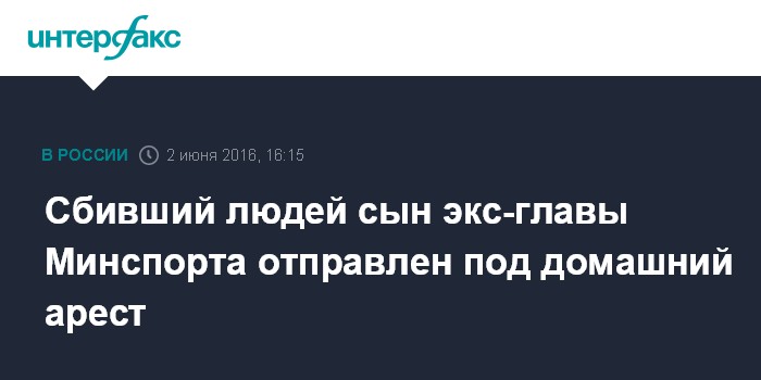 Москва. 2 июня. INTERFAX.RU - Подольский городской суд в четверг санкционировал домашний арест до 28 июля сына бывшего главы Минспорта РФ Антона Иванюженкова, который, управляя внедорожником, врезался в автобусную остановку с людьми.