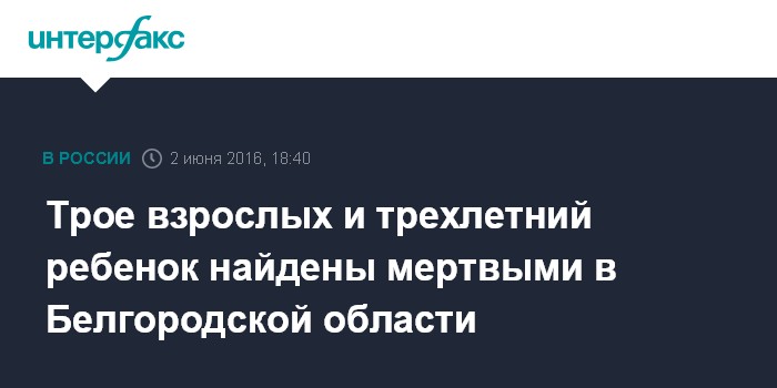 Москва. 2 июня. INTERFAX.RU - Тела четырех человек обнаружены в четверг в селе Русская Халань Чернянского района Белгородской области, все они - члены одной семьи, среди них - ребенок.