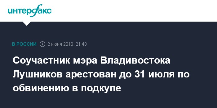Соучастник мэра Владивостока Лушников арестован до 31 июля по обвинению в подкупе