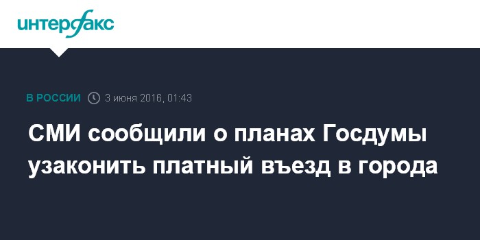 Москва. 3 июня. INTERFAX.RU - Комитет по транспорту рекомендовал Госдуме принять в первом чтении законопроект «Об организации дорожного движения...». Как отмечают "Ведомости", инициатива позволит региональным и городским властям вводить в регионе платный въезд.