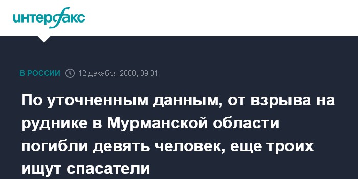 Москва. 12 декабря. INTERFAX.RU - В результате взрыва на Расвумчоррском руднике в Мурманской области погибли девять человек, пострадали четыре человека, судьба еще трех человек неизвестна, сообщил "Интерфаксу" сотрудник пресс-службы областного МЧС.