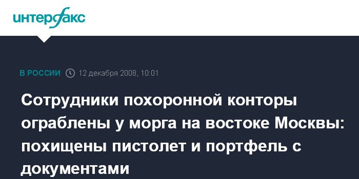 Москва. 12 декабря. INTERFAX.RU - На востоке Москвы совершено разбойное нападение на двух сотрудников похоронной конторы.