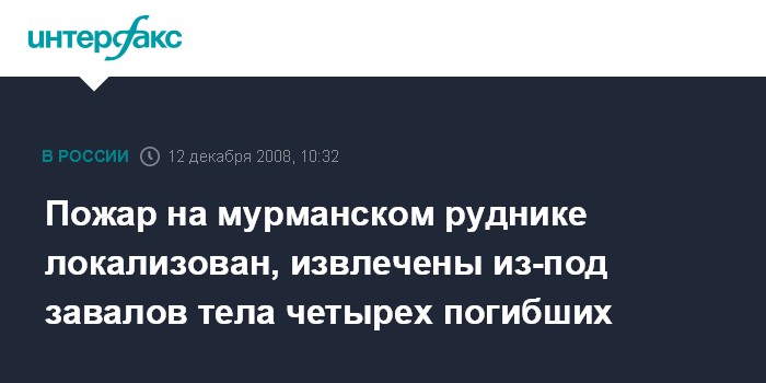 Москва. 12 декабря. INTERFAX.RU - Спасателям удалось извлечь из-под завалов на Расвумчоррском руднике тела четырех погибших.