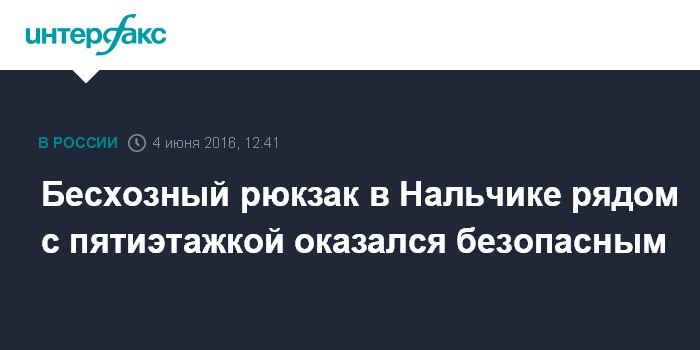 Москва. 4 июня. INTERFAX.RU - Взрывотехники убедились в безопасности рюкзака, забытого рядом с домом на улице Идарова в Нальчике, сообщил в субботу "Интерфаксу" источник в правоохранительных органах Кабардино-Балкарии.