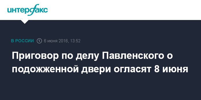 Москва. 6 июня. INTERFAX.RU - Мещанский суд Москвы 8 июня огласит приговор по делу в отношении художника-акциониста Петра Павленского, которого гособвинение просит оштрафовать на полтора миллиона рублей за поджог двери здания ФСБ на Лубянке.