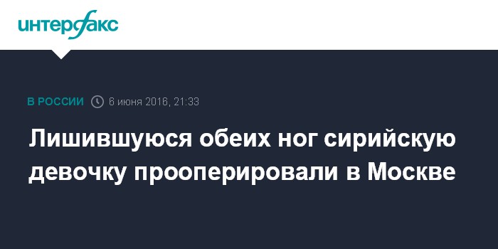 Москва. 6 июня. INTERFAX.RU - Раненная боевиками в Алеппо сирийская девочка, доставленная на лечение в Москву, была успешно прооперирована, сообщил "Интерфаксу" директор Департамента общественного здоровья и коммуникаций Минздрава РФ Олег Салагай.