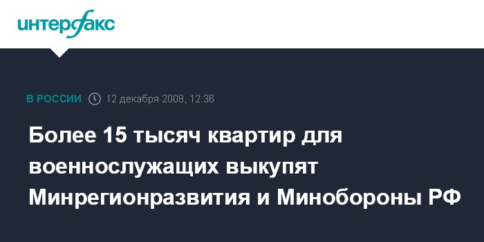 "Процесс приобретения жилья будет проходить на основе котировочных заявок объединенной котировочной комиссии Минобороны и Минрегионразвития. Подача заявок от строительных организаций завершится 12 декабря. В общей сложности в 65 российских регионах будет выкуплено 15 тыс. 700 квартир на сумму около 32,6 млрд рублей", - сказала она.