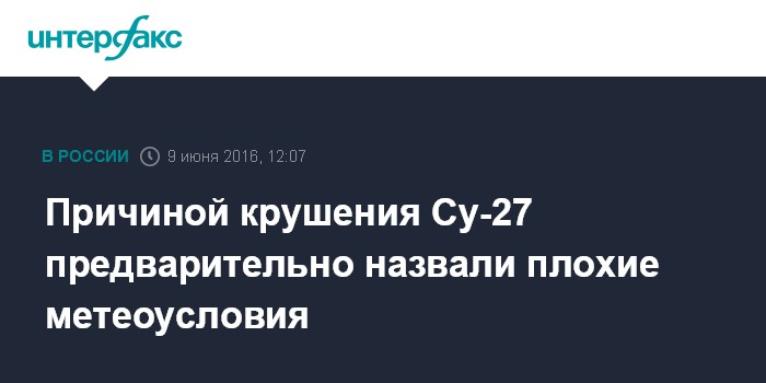 "Созданная Минобороны РФ специальная комиссия детально изучит все версии крушения Су-27: отказ техники, ошибка летчика, плохие метеоусловия и другие. По предварительным данным, причиной катастрофы истребителя Су-27 пилотажной группы "Русские витязи" могли стать плохие метеоусловия", - сказал собеседник агентства.
