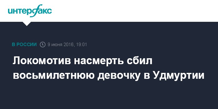 Москва. 9 июня. INTERFAX.RU - Восьмилетняя девочка в четверг днем погибла под колесами локомотива в удмуртском Сарапуле, сообщили "Интерфаксу" в пресс-службе Ижевского региона Горьковской железной дороги.