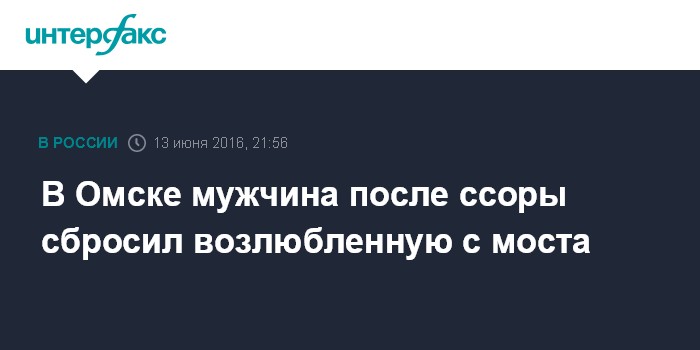 Москва. 13 июня. INTERFAX.RU - Житель Омска в ходе ссоры сбросил свою возлюбленную с моста, сообщает СК РФ по Омской области в понедельник. .