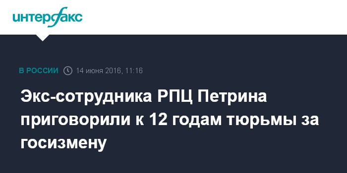 Москва. 14 июня. INTERFAX.RU - Мосгорсуд приговорил к 12 годам колонии строгого режима бывшего сотрудника Отдела внешних церковных связей Московского патриархата Евгения Петрина, признанного виновным в государственной измене в пользу США.