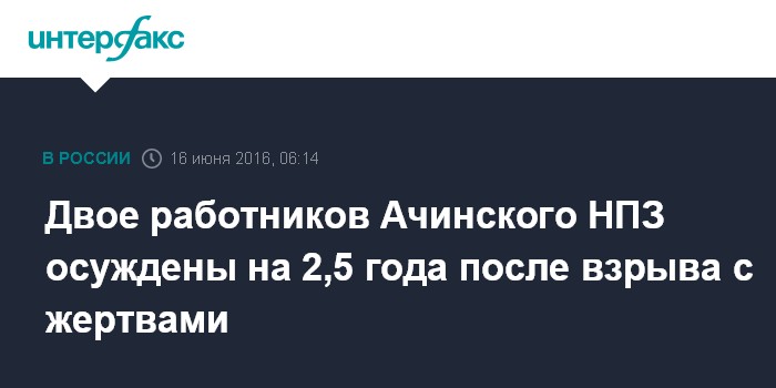 Москва. 16 июня. INTERFAX.RU - Большеулуйский районный суд Красноярского края вынес обвинительный приговор ведущему инженеру отдела технического надзора и оператору технологических установок ОАО "АНПЗ ВНК", по вине которых произошел взрыв и погибли восемь человек.