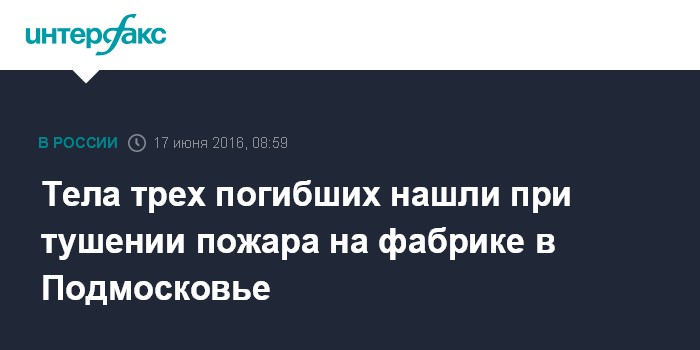 Москва. 17 июня. INTERFAX.RU - ТСпасатели обнаружили тела трех погибших в ходе тушения пожара на мебельной фабрике в подмосковном городе Фрязино, сообщил "Интерфаксу" в пятницу источник в медицинских кругах.