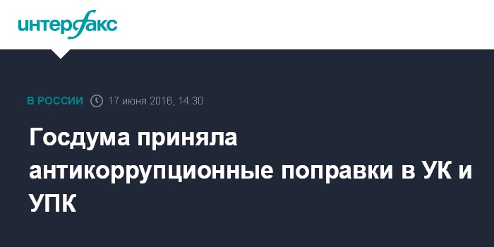 Москва. 17 июня. INTERFAX.RU - Госдума в пятницу приняла сразу во втором и в третьем чтениях закон, усиливающий уголовную ответственность за коррупционные преступления.