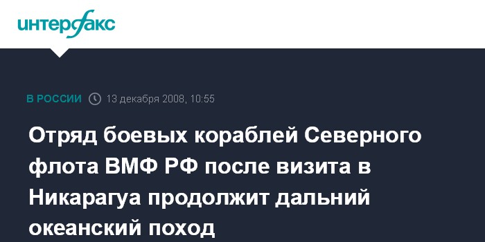 Москва. 13 декабря. INTERFAX.RU - Корабли Военно-морского флота России после завершения визита в никарагуанский порт Блуфилд продолжат дальний поход, сообщили "Интерфаксу-АВН" в субботу в главном штабе ВМФ РФ.
