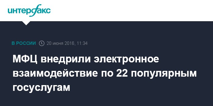 Москва. 20 июня. INTERFAX.RU - Многофункциональные центры (МФЦ) и ведомства, чтобы повысить скорость оказания госуслуг, уже внедрили электронное взаимодействие по 22 популярным госуслугам, еще по 17 электронные сервисы разработаны и проходят сейчас тестирование, сообщил "Интерфаксу" статс-секретарь - заместителя министра экономического развития РФ Олег Фомичев.
