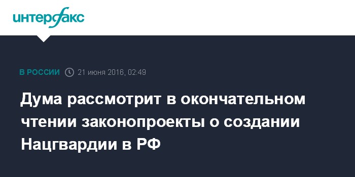 Москва. 21 июня. INTERFAX.RU - Госдума на заседании во вторник рассмотрит во втором и окончательном третьем чтении пакет законопроектов о создании в России Национальной гвардии.