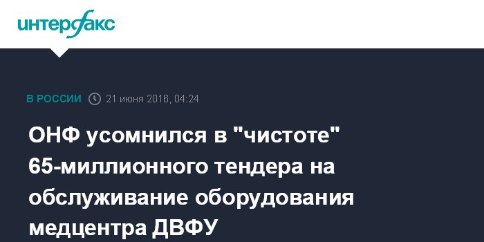 Москва. 21 июня. INTERFAX.RU - Эксперты ОНФ в Приморье попросили прокуратуру региона проверить законность проведения и итогов тендера на обслуживание оборудования медицинского центра Дальневосточного федерального университета (ДВФУ).